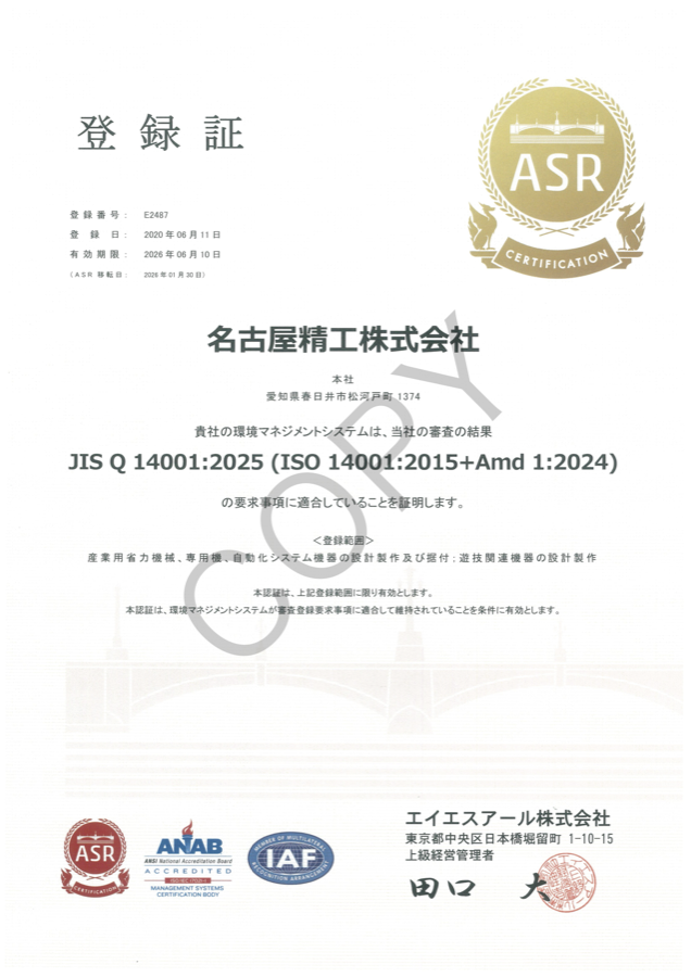 | 平成29年11月 | ISO9001:2015 認証取得(産業機械部門) |